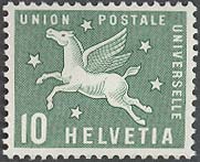 On the first row of images we show the building of UPU's headquarter in Bene, Switzerland, and the sculpture of Pegasus, placed on this building. The second row displays the stamps issued in 1957 and in 1960 by the UPU. These stamps, still in use, can be put only on letters sent by the International Bureau in Berne. The plate and the stamps on the last row are works of the renown Swiss artist Hans Erni. The artist has overlapped the legendary image of the winged horse with the stars forming the Pegasus constellation.