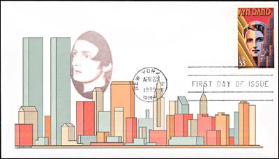 On the 22nd of April, 1999, the United States Postal Service has issued a stamp dedicated to the philosopher and novelist Ayn Rand, the author of Atlas Shrugged, philosophically the most challenging bestseller of its time. Her first novel, We the Living, was published in 1936. With the publication of The Fountainhead in 1943, she achieved a spectacular and enduring success. Miss Rand's unique philosophy, Objectivism, has gained a worldwide audience.