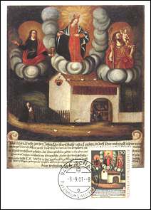 The three votive pictures featured on Liechtenstein's 3rd September 2001 stamps issue date from the early 18th century. The votive picture on the 70 Rp. stamp comes from the Chapel of Our Lady at Dux in Schaan and represents a popular type of anonymous ex voto picture. The picture, which dates from 1733, features Mary as the Queen of heaven, top left, with the child Jesus. The donor of the ex voto kneels with folded hands below her to the right. The reason of this ex voto picture (illness, accident, etc.) is not known.